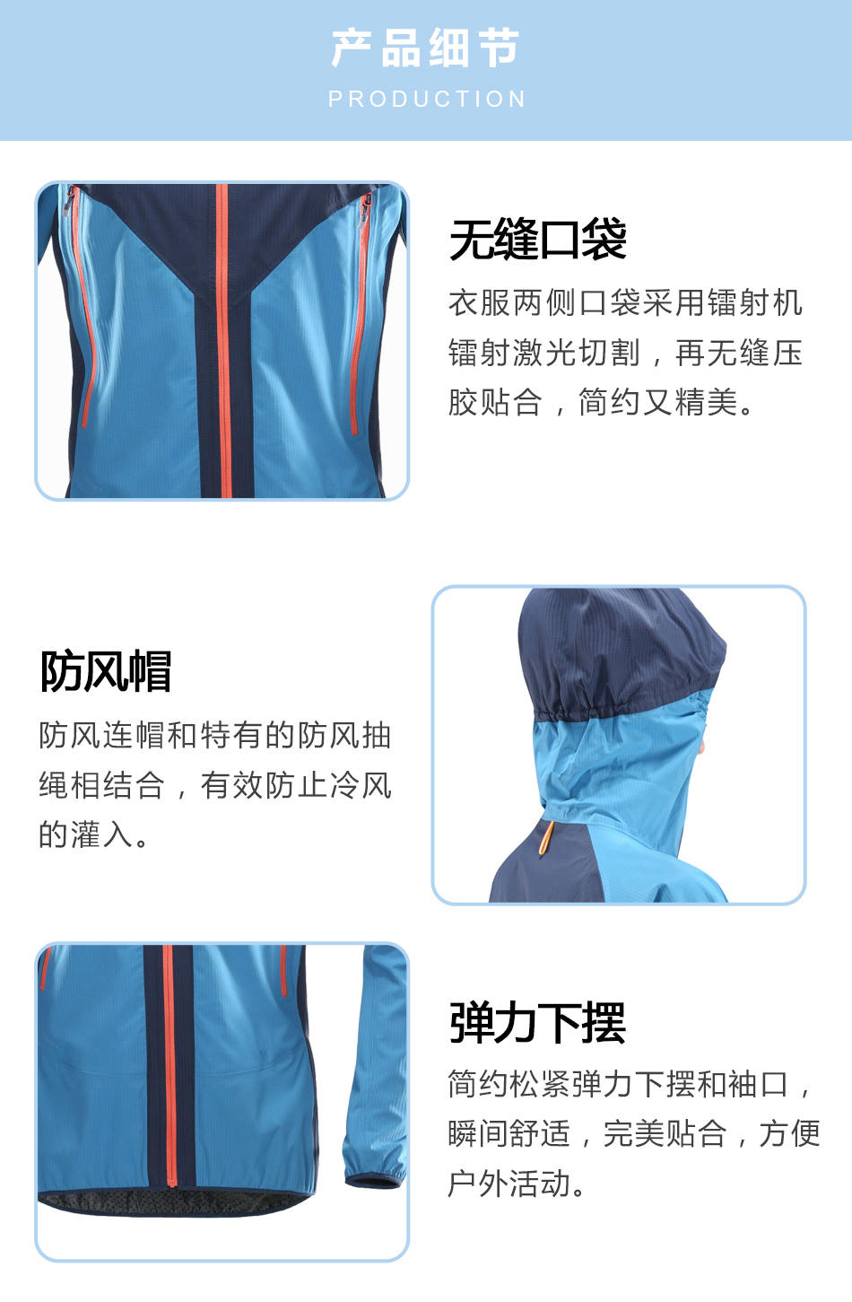 彈力下擺:簡(jiǎn)約松緊彈力下擺和袖口,瞬間舒適,完美貼合,方便戶(hù)外活動(dòng)。